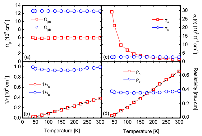圖3 兩個Drude的溫度依賴。(b)和(d)兩個面板分別是散射率和等效電阻對溫度的依賴關系,其中的兩條黑色虛線是線性擬合的結果。