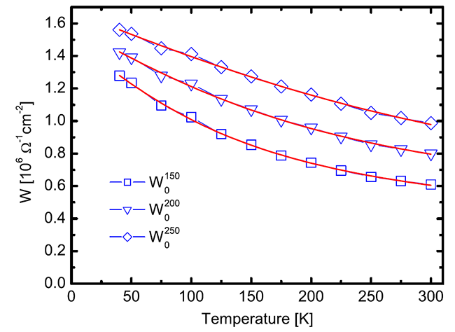 圖4 低頻光電導譜權重隨溫度的變化曲線。3個不同截止頻率對應的曲線都滿足arctan(T)的關系。