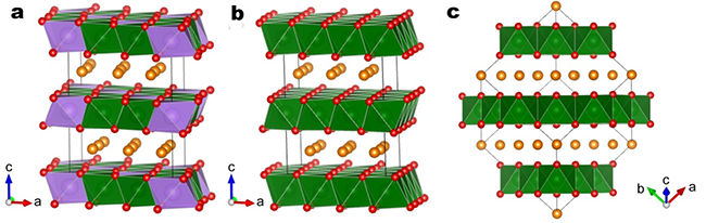 圖1 計(jì)算模型:(a) P2-Na[Li0.33Ti0.67]O2,(b) P2-NaTiO2,(c) O3-NaTiO2。橙色、紫色、綠色和紅色分別代表鈉、鋰、鈦和氧