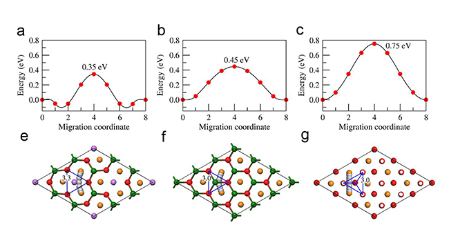 圖2 Na+離子擴(kuò)散活化能和擴(kuò)散路徑:(a, e) P2-Na[Li0.33Ti0.67]O2,(b, f) P2-NaTiO2,(c, g) O3-NaTiO2