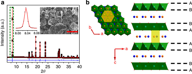 圖3 P2-Na0.66[Li0.22Ti0.78]O2材料的形貌及結(jié)構(gòu)圖:(a) XRD圖譜及形貌,(b)樣品的結(jié)構(gòu)圖