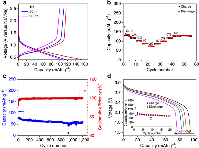 實(shí)驗(yàn)結(jié)果分析表明,該材料為P2層狀氧化物,空間群為P63/mmc,Li\Ti占過渡金屬位,鈉占?jí)A金屬層間的兩個(gè)位置(2b,2d),與上下氧形成三棱柱結(jié)構(gòu);材料的顆粒尺寸在10-15微米之間(如圖3所示);圖4a可以看出該材料在C/10倍率下顯示116 mAh/g左右的可逆容量,對(duì)應(yīng)0.34個(gè)Na的嵌入和脫出,200周循環(huán)后容量保持率為88%;平均儲(chǔ)鈉電壓為0.75V,遠(yuǎn)高于金屬鈉的沉積電位;充放電曲線為斜坡狀,可能為單相反應(yīng),與常見層狀P2相氧化物多相反應(yīng)機(jī)制不同;同時(shí)該材料在2C的倍率下循環(huán)1200周后容量保持率為75%(圖4c),顯示極其穩(wěn)定的循環(huán)性能;當(dāng)該負(fù)極材料與磷酸釩鈉/碳復(fù)合正極組裝成全電池時(shí),其平均工作電壓為2.5V,顯示較好的循環(huán)和倍率性能(圖4d)。該材料室溫下Na+離子表觀擴(kuò)散系數(shù)約為1×10-10cm2/s,與計(jì)算結(jié)果符合比較好,并和Li+離子嵌入石墨的擴(kuò)散系數(shù)相當(dāng)(圖8)。