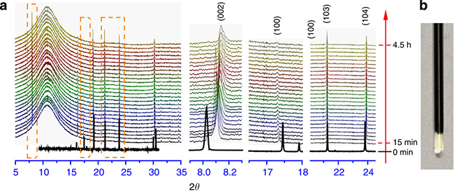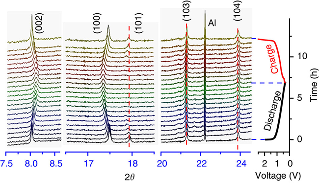 圖7. 化學(xué)鈉化過程中P2-Na0.66[Li0.22Ti0.78]O2材料的結(jié)構(gòu)變化:同步輻射原位XRD圖譜