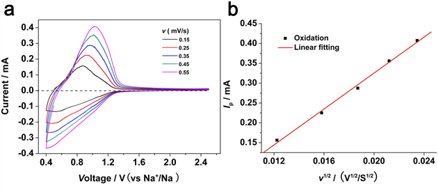 圖8 Na+離子表觀擴(kuò)散系數(shù)測(cè)量:(a)不同掃描速度的CV曲線,(b)氧化峰電流與掃描速度(v1/2)的關(guān)系