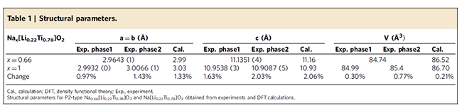 與美國Brookhaven國家實(shí)驗(yàn)室楊曉青研究員和禹習(xí)謙博士等合作,采用同步輻射原位XRD技術(shù)對(duì)嵌/脫過程中材料結(jié)構(gòu)的演化進(jìn)行了深入研究。與傳統(tǒng)P2層狀材料在嵌/脫鈉反應(yīng)過程中出現(xiàn)多個(gè)相變的反應(yīng)機(jī)理不同,研究人員發(fā)現(xiàn)鋰摻雜過渡金屬層的P2層狀材料在嵌/脫鈉過程中表現(xiàn)出近似單相行為(圖5為充放電過程中的原位XRD圖譜)。對(duì)材料放電態(tài)(完全嵌鈉狀態(tài))的結(jié)構(gòu)進(jìn)行精確確定,進(jìn)一步證明材料仍然保持P2層狀結(jié)構(gòu),嵌鈉前后體積變化僅為0.77%(見表1),近似零應(yīng)變,這也說明了該材料為什么顯示了極其穩(wěn)定的循環(huán)性能。為了避免電化學(xué)非原位測(cè)試制備過程中樣品可能暴露空氣從而導(dǎo)致Ti3+氧化,同時(shí)也采用化學(xué)鈉化原位XRD技術(shù),結(jié)果同樣表明鈉在嵌入過程中材料保持P2層狀結(jié)構(gòu),這為鈉的嵌入\脫出材料結(jié)構(gòu)的變化提供了有力的證據(jù),具體結(jié)果如圖6和7所示。