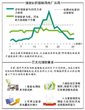 在風電渦輪和太陽能板旁安裝儲能電站,可以幫助緩解這個矛盾。大風天氣和陽光充沛的時段,它們可以向電網(wǎng)提供清潔并可循環(huán)利用的電能,然而到了無風天氣和太陽下山后,需依靠可以儲存多余電能的儲能電站,來減少可再生能源的棄風損失。