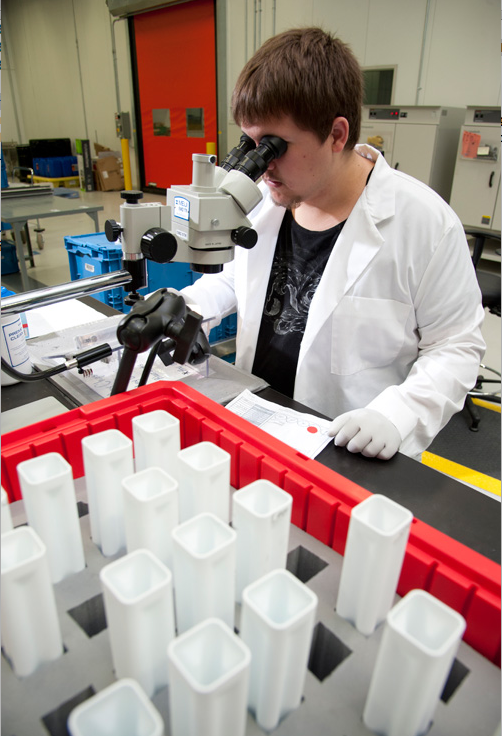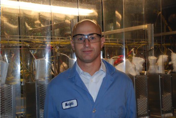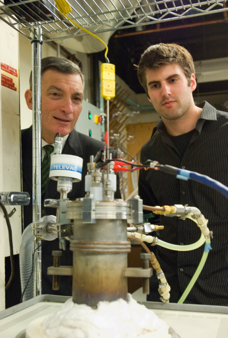 唐納德·山德維教授和材料加工中心研究聯(lián)盟的大衛(wèi)·布拉德韋爾在實(shí)驗(yàn)室里觀察一塊小型測(cè)試電池。電池內(nèi)部中心是一塊高度絕緣的金屬圓筒,它可以將電池加熱到700℃(攝影:Patrick Gillooly)