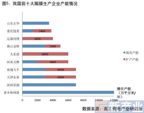 圖5中涉及的比較大的幾個(gè)擴(kuò)產(chǎn)計(jì)劃包括,浙江大東南包裝股份有限公司將于2012年年底完成4條干法雙拉和4條濕法生產(chǎn)線,正式量產(chǎn)預(yù)計(jì)不晚于2013年年底,屆時(shí)產(chǎn)能預(yù)計(jì)將達(dá)到6000萬平方米/年。天津東皋膜技術(shù)有限公司正在建7000萬平方米/年的濕法生產(chǎn)線。南通天豐電子新材料有限公司2012年新增了四條生產(chǎn)線,預(yù)計(jì)擴(kuò)產(chǎn)4000萬平方米/年,且2013年即可上線。河南義騰新能源科技有限公司2012年6月完成擴(kuò)增四條生產(chǎn)線,預(yù)計(jì)2013年上半年上線。