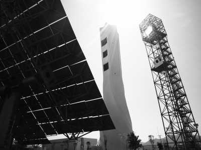 一進(jìn)入電站,記者首先被眼前一個(gè)造型優(yōu)雅的龐然大物所吸引,這是個(gè)白色的六邊形柱體,朝北一側(cè)靠近頂端的位置留有三個(gè)“窗口”。“這叫太陽塔,也叫集熱塔,它高120米,那三個(gè)窗口將用來安裝集熱器。”電站站長馬廣成告訴記者,“之所以留三個(gè)窗口,是因?yàn)槲覀冸娬臼菍?shí)驗(yàn)電站,可以通過裝不同的集熱器,以測試其性能特點(diǎn),從而選擇更適合的集熱器技術(shù)。”