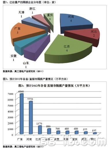 根據(jù)高工鋰電產(chǎn)業(yè)研究所(GBII)統(tǒng)計,預計2012全年隔膜總產(chǎn)量將達到1.66億平方米,總產(chǎn)能將突破4.5億平方米。結合國內(nèi)已經(jīng)成功實現(xiàn)產(chǎn)業(yè)化的幾家隔膜廠商,目前我國隔膜企業(yè)實際產(chǎn)量和設計產(chǎn)能之間存在較大差異,主要原因一方面是目前國內(nèi)企業(yè)受限于生產(chǎn)工藝,面向市場的不同,平均收率水平約40%左右;另一方面,受今年上半年宏觀經(jīng)濟下滑影響,廠商目前無法滿負荷生產(chǎn),有些廠商甚至關閉部分生產(chǎn)線,因此壓低了廠商的產(chǎn)量并提高了生產(chǎn)成本。