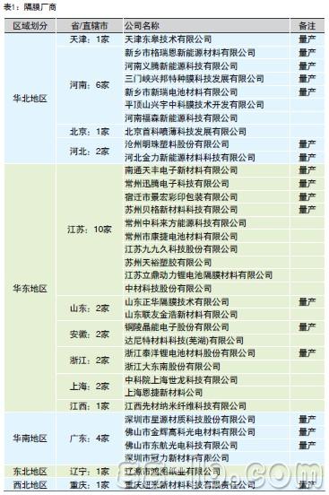 隨著鋰離子電池產(chǎn)業(yè)的快速發(fā)展,我國鋰電池隔膜產(chǎn)量逐漸增長。由于利潤率較高,大概在20%左右,吸引了越來越多的企業(yè)進入鋰離子電池隔膜領域。據(jù)高工鋰電產(chǎn)業(yè)研究所(GBII)統(tǒng)計,國內(nèi)共有35家隔膜生產(chǎn)廠商,其中18家已經(jīng)量產(chǎn),占總數(shù)的51.43%。從區(qū)域劃分的角度來看,華東地區(qū)共有1 9家廠商,占總數(shù)的54%;華北地區(qū)共有10家廠商,占總數(shù)的29%;華南地區(qū)共有4家廠商,占總數(shù)的11%;東北和西北地區(qū)分別有1家廠商。珠三角、長三角和華北地區(qū)實現(xiàn)規(guī)模產(chǎn)業(yè)化的企業(yè)數(shù)量較為集中,結合鋰電池終端產(chǎn)品企業(yè)的地域分布,未來鋰電池隔膜行業(yè)有望在上述三個地區(qū)形成產(chǎn)業(yè)集群。具體隔膜企業(yè)名稱如表1所示。