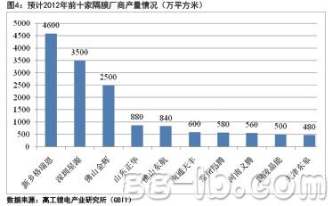 根據(jù)高工鋰電產(chǎn)業(yè)研究所(GBII)統(tǒng)計數(shù)據(jù)顯示,從產(chǎn)量規(guī)模上看,新鄉(xiāng)格瑞恩、深圳星源和佛山金輝仍處于國產(chǎn)隔膜廠商的第一階梯,預計2012年產(chǎn)量分別為4600萬m2、3500萬m2和2500萬m2;南通天豐、山東正華、佛山東航和河南義騰等處于第二階梯。前十位隔膜廠商產(chǎn)量情況如圖4所示。
