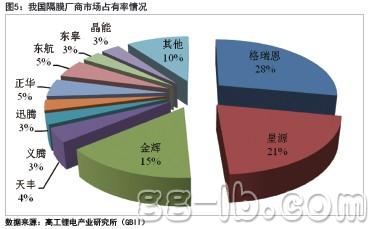 隨著南通天豐、河南義騰、山東正華和佛山東航等廠家產(chǎn)能逐漸釋放,相比于2011年,2012年的市場格局已經(jīng)發(fā)生了一定變化。從企業(yè)的占有率來看,他們占有率依次是:新鄉(xiāng)格瑞恩占28%,深圳星源達占21%,佛山金輝占15%。具體占有率如圖5所示。