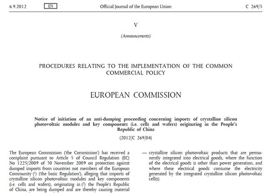 中國儲能網(wǎng)訊:歐盟對華發(fā)起太陽能光伏產(chǎn)品反傾銷調(diào)查如箭在弦,歐盟關(guān)于此事的正式通知已于今日(9月6日)上午發(fā)出。
