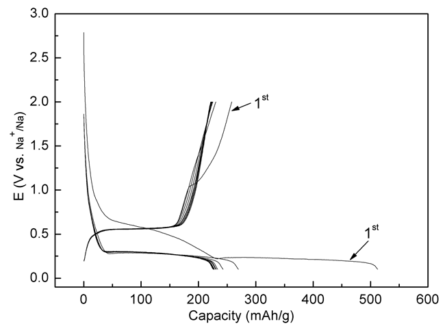 目前已報(bào)道多種很有前途的正極材料,例如碳包覆的具有NASICON結(jié)構(gòu)的Na3V2(PO4)3復(fù)合材料 (Jian Z L, Zhao L, Pan H L, Hu Y S, Li H, Chen W, Chen L Q,Carbon coated Na3V2(PO4)3 as novel electrode material for sodium ion batteries. Electrochem. Commun., 2012 14: 86–89.)。從最近取得的研究進(jìn)展來看,發(fā)展室溫鈉離子儲(chǔ)能電池最大的挑戰(zhàn)是沒有合適的負(fù)極材料。在眾多負(fù)極材料中,硬碳材料顯示了比較好的綜合性能,可逆容量達(dá)到200 mAh/g,首周庫侖效率80%以上,循環(huán)也很穩(wěn)定,但是硬碳儲(chǔ)鈉電位接近0 V,在快速充電過程中,可能會(huì)導(dǎo)致鈉在硬碳表面的沉積和鈉枝晶的生長(zhǎng),從而帶來安全隱患,需要研發(fā)新型安全的高電壓(相對(duì)于鈉的沉積電位要高)負(fù)極材料。