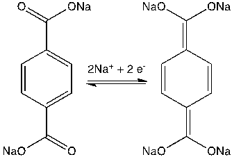 圖 1 有機(jī)負(fù)極材料對(duì)苯二甲酸二鈉(Na2C8H4O4)的分子式及儲(chǔ)鈉機(jī)制。苯環(huán)上連的兩個(gè)羧基中的羰基可以和兩個(gè)鈉離子結(jié)合和分開,實(shí)現(xiàn)鈉離子的可逆嵌入和脫出,對(duì)應(yīng)255 mAh/g的理論比容量。