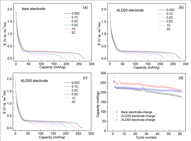 圖 3 Na2C8H4O4/KB未包覆的初始電極、ALD20電極(約2 nm Al2O3 包覆)、ALD50(約5 nm Al2O3包覆)電極不同充放電倍率下的放電曲線(a-c)以及0.1C倍率下的循環(huán)性能(d)。