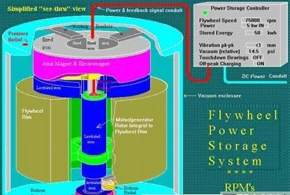 1994年,美國阿貢(ANL)國家實驗室用碳纖維試制一個儲能飛輪:直徑38厘米,質(zhì)量為 11千克,采用超導(dǎo)磁懸浮,飛輪線速度達1000米/秒。它儲的能量可將10個100瓦燈泡點燃2~5小時。該實驗室目前正在開發(fā)儲能為50千瓦小時的儲能輪,最終目標(biāo)是使其儲能達5000千瓦小時的儲能飛輪。一個發(fā)電功率為100萬千瓦的電廠,約需這樣的儲能輪200個。