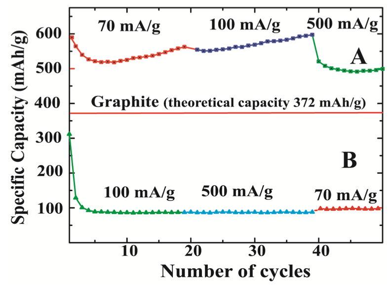 長期穩(wěn)定的放電容量比:(A)銅涂層氫化非晶硅;(B)原始?xì)浠蔷Ч?;中間紅線表示石墨的理論存儲(chǔ)容量。來源:得克薩斯大學(xué)