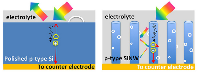 王德利的研究小組模仿這種結(jié)構(gòu),他們的“三維枝杈納米線陣列”(3D branched nanowire array)采用了一種工藝,稱為光電化學(photoelectrochemical)水解,可以產(chǎn)生氫氣。分解水所指的過程可以把水分離成氧和氫,提取氫氣作為燃料使用。這項工藝使用清潔能源,沒有溫室氣體副產(chǎn)品。相比之下,目前的傳統(tǒng)制氫方式依靠化石燃料供電。