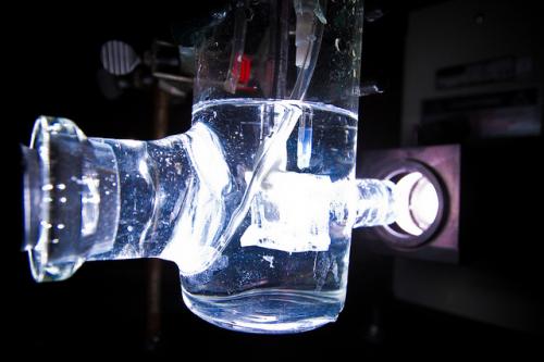 在這個實驗中,納米樹電極浸在水中,用模擬太陽光照亮,可測量設備的電力輸出。來源:加州大學。