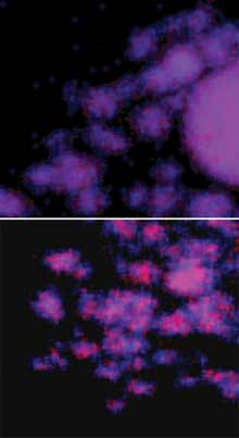 閃亮的殼:當(dāng)一個(gè)4納米的鉑銅合金納米粒(上)暴露在周期性的交流電中,銅原子從表面分離,生成一個(gè)富含鉑的殼。在掃描傳送式電子顯微鏡下,它的圖像更亮(下)。 來源:彼得•斯特拉瑟(Peter Strasser)