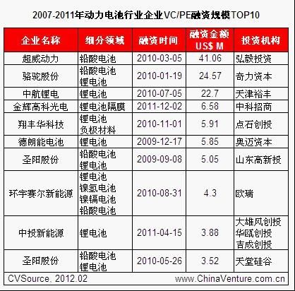 表22007-2011年動力電池行業(yè)企業(yè)VC/PE融資規(guī)模TOP10
