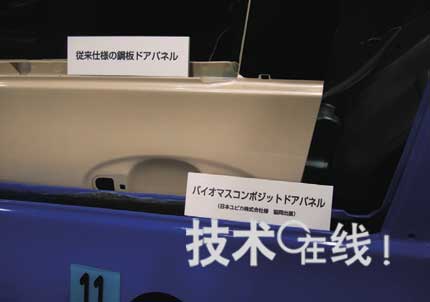 日本杰斯比(JSP)和優(yōu)必佳(U-PICA)展出了采用經(jīng)過(guò)玻璃纖維強(qiáng)化處理的植物性樹(shù)脂(植物性FRP)和植物性發(fā)泡芯材相結(jié)合的“復(fù)合板”制成的汽車車門板(圖2)。包含玻璃窗在內(nèi),這種復(fù)合板車門約重21kg,比約28kg的鋼板車門輕7kg。還有望提高隔熱性、吸音性及沖擊吸收性等性能。