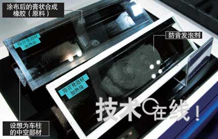 | 圖4:涂布型防音發(fā)泡劑“Penguin Form”(盛勢(shì)達(dá)技研) 將含有發(fā)泡劑的膏狀合成橡膠填入車柱中,通過(guò)加熱使其發(fā)泡。這樣,車輛行駛時(shí)的風(fēng)切音等噪音就不易傳入車內(nèi)。照片遠(yuǎn)處為發(fā)泡前的狀態(tài),近處為發(fā)泡后的狀態(tài)。 |