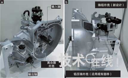 | 圖8:驅(qū)動(dòng)用馬達(dá)減速機(jī)(富士機(jī)械) 已配備于斯巴魯Plugin Stella。屬于兩檔減速型,輸入軸與馬達(dá)軸連接。內(nèi)部有中間軸(照片上看不到),輸出軸與車輪端相連(a)。鋁壓鑄離合器殼體沿用了現(xiàn)有部件。殼體蓋為新制造,由模具費(fèi)用比鋁壓鑄品低的鋁鑄造品制成(b)。 |