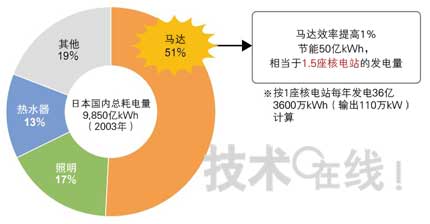 新式馬達(dá)最有望在節(jié)能方面收到廣泛的效果。有試算結(jié)果表明,馬達(dá)的耗電占到日本國內(nèi)總耗電量9850億kWh的51%(圖2)。如果馬達(dá)驅(qū)動的機(jī)器效率能提高1%,則可節(jié)約1.5座核電站的發(fā)電量。