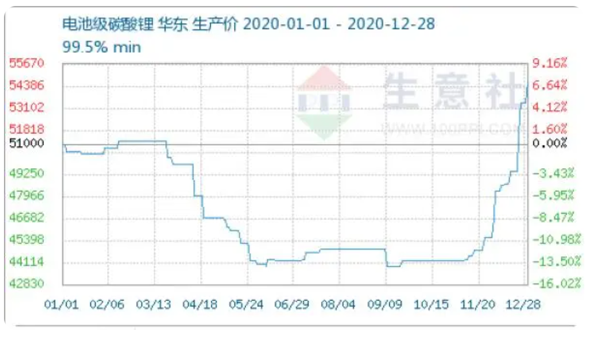 在2020年第四季度,隨著鋰鹽原材料價格成本上漲,貨源緊張,帶動碳酸鋰價格上行至2021年年初的5、6萬元/噸的水平。2021年下半年開始,受下游新能源汽車市場需求的帶動,尤其是磷酸鐵鋰電池大幅替代三元鋰電池的趨勢,碳酸鋰的價格一路高漲。