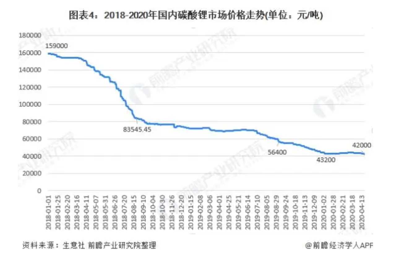 據(jù)前瞻產(chǎn)業(yè)研究院當(dāng)時分析,2018年—2020年碳酸鋰價格下滑,原因主要有兩個方面:一是在需求端,動力電池市場整體疲軟,電池企業(yè)生產(chǎn)積極性不高,正極材料廠相應(yīng)削減產(chǎn)量,導(dǎo)致碳酸鋰需求下降;二是在供給端,上有鋰礦產(chǎn)能開始釋放,供給大于需求。再加之海外疫情的擴散,東南亞地區(qū)多家終端工廠宣布停產(chǎn),同時大量出口訂單面臨取消,多重因素導(dǎo)致電池級碳酸鋰訂單零星,工業(yè)級碳酸鋰訂單出現(xiàn)下滑。