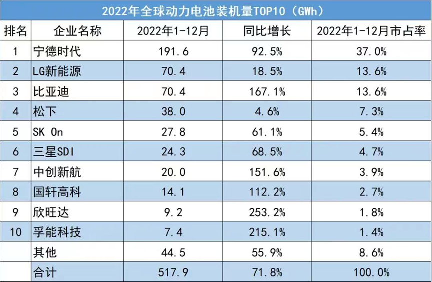 寧德時代作為我國動力電池龍頭企業(yè),現(xiàn)已發(fā)展成為全球最大的動力電池廠商。SNE Research數(shù)據(jù)顯示,2022年,寧德時代以191.6 GWh的裝車量和37%的市占率,連續(xù)8年產(chǎn)銷位居世界第一。除了寧德時代之外,在全球排名前十的動力電企業(yè)中,有六家來自中國,總市占率超過六成。