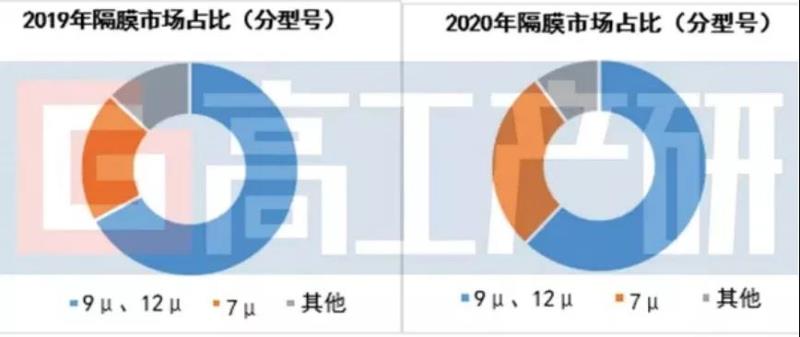 從產(chǎn)品型號來看,2020年受動力能量密度提升、三元動力以及鈷酸鋰數(shù)碼電池出貨量增長帶動,國內(nèi)鋰電池隔膜向薄層化以及功能化方向發(fā)展加快。2020年細分產(chǎn)品型號主要集中在7/9/12μm領域,其中5μm濕法隔膜正在加快市場導入,這將對隔膜企業(yè)在產(chǎn)品質(zhì)量和技術方面提出更高的要求。