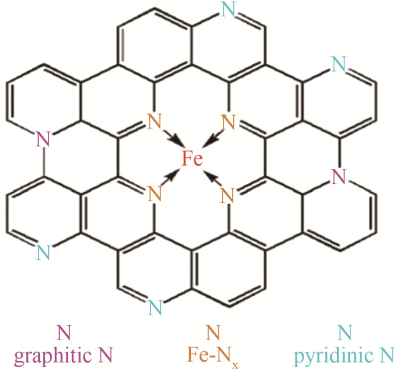 碳材料具有成本低、穩(wěn)定性好、比表面積大和導電率高等顯著優(yōu)點,其作為催化劑載體或非貴金屬催化劑受到廣泛關(guān)注[4]。在氧氣的電化學催化中,氧氣可以在碳材料表面發(fā)生吸附和還原,但碳材料表面的氧還原反應是以產(chǎn)生過氧化物的二電子途徑進行,往往需要很高的過電位,不利于能量利用效率的提高。為了改善碳材料的氧還原性能,可以通過非金屬雜原子(N、S、P、B)摻雜或結(jié)構(gòu)調(diào)整來提高催化活性。Dai等首次發(fā)現(xiàn)非金屬碳材料是有效的ORR電催化劑,研究表明在碳納米管中摻雜氮改變了氧氣的化學吸附模式,促進四電子反應進行,這可以有效地削弱或破壞氧氧鍵,顯著提高了ORR催化活性。摻雜在碳材料中的氮以吡啶型氮、吡咯型氮和石墨型氮的形式存在,通過改變氮源、調(diào)整溫度和合成方法可以得到不同比例的3種形式,但是目前對影響催化活性的氮的形式還沒有具體的定論。