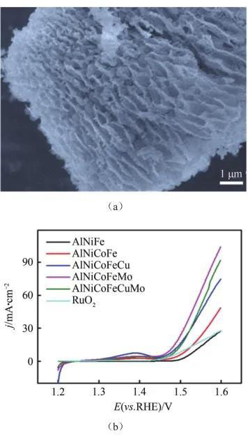 增加催化劑的化學復雜性,是調(diào)整催化劑活性的重要途徑。在單一固溶相中含有五種或五種以上金屬的合金通常被稱為高熵合金(HEAs),它們表現(xiàn)出不同尋常的穩(wěn)定性和耐腐蝕性,同時也提供了一個調(diào)節(jié)合金表面電子性質(zhì)和催化活性的平臺,HEAs在催化和能量儲存/轉(zhuǎn)化方面有著巨大的應用前景。Qiu等利用脫合金法制備了納米多孔高熵合金(np-HEAs)電催化劑[圖3(a)],其中以np-AlNiCoFeX(X=Mo,Nb,Cr)五元體系的OER催化活性最高[圖3(b)]。分析表明,在一個單相納米結(jié)構(gòu)中加入五種或多種過渡金屬元素具有協(xié)同作用,克服了常規(guī)二元或三元合金的限制,五元體系的形成大大提高了電化學循環(huán)的穩(wěn)定性,同時也為提高催化性能提供了更多的結(jié)構(gòu)和化學自由度。