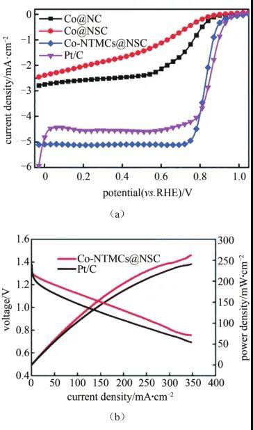 過渡金屬本身具有高催化活性,但抗氧化性能差。研究發(fā)現(xiàn),過渡金屬顆粒和碳材料復合作為ORR和OER雙功能催化劑表現(xiàn)出強的催化性能。在這種復合結(jié)構(gòu)中,過渡金屬可以增加碳化過程中碳材料的石墨化程度,包裹在表面的碳材料可以有效的防止金屬團聚以確保分散,同時可以促進電子的轉(zhuǎn)移。Zhu等通過功能聚合物的可控自組裝制備了鈷摻雜含氮和硫的多孔碳球(Co-NTMCs@NSC),Co原子均勻分布在碳球表面,提高了材料本征催化活性。測試顯示ORR半波電位為0.833V[圖2(a)],在堿性介質(zhì)中具有良好的耐甲醇能力和長期的耐用性。此外,它還表現(xiàn)出高效的OER催化活性,在10 mA/cm2下具有284 mV的過電位。用作可充電鋅空氣電池的空氣陰極時,在充放電循環(huán)的12 h內(nèi)顯示出高的峰值功率密度262 mW/cm2[圖2(b)]和小的充放電電壓間隙,優(yōu)于Pt/C基空氣陰極。Ma等同樣采用高溫熱解聚合物法制備了碳納米管包覆合金納米粒子催化劑,作為鋅空氣電池空氣陰極催化劑時顯著地提高了電池的循環(huán)穩(wěn)定性,并表現(xiàn)出高的峰值功率密度。
