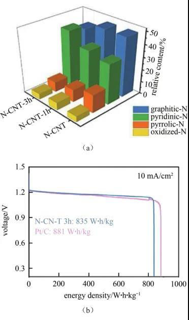 Yang等通過熱解三聚氰胺和L-半胱氨酸混合物,控制碳化溫度,制備出了高活性的氮摻雜三維石墨烯納米帶網(wǎng)絡(N-GRW),在鋅空氣電池中的開路電壓為1.46 V,峰值功率密度和比容量分別為65 mW/cm2和873 mA·h/g,具有良好的循環(huán)穩(wěn)定性,分析認為吡啶氮結(jié)構(gòu)起主要催化作用。為了提高吡啶氮的含量,Yi等利用高錳酸鉀刻蝕空心管型聚吡咯制備了氮摻雜碳納米管,通過刻蝕碳材料引入了豐富孔結(jié)構(gòu)和缺陷,使得更多N原子處在邊緣位置,吡啶氮的含量由32.8%提升到了45.2%[圖1(a)],該催化劑在堿性條件下具有優(yōu)于商業(yè)Pt/C的半波電位(0.83 V)和穩(wěn)定性,應用于鋅空氣電池中,顯示出122 mW/cm2的峰值功率密度和835 W·h/kg的能量密度[圖1(b)],與商業(yè)Pt/C近似。