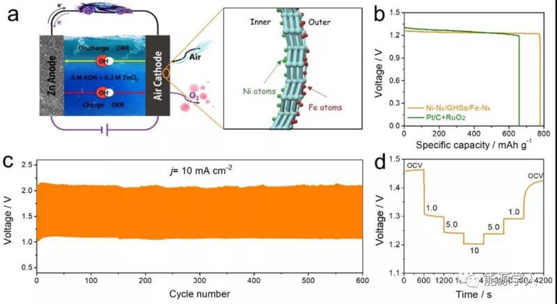 圖3 以Ni-N4/GHSs/Fe-N4雙單原子組裝的鋅-空氣電池的性能。(a) 示意圖;(b)恒流密度5 mA cm?2時(shí)的放電曲線;(c) 10 mAcm?2的充放電電壓分布圖;(d) 不同電流密度下的放電曲線。