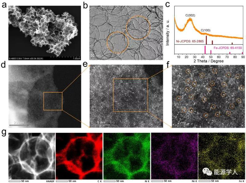 圖2 Ni-N4/GHSs/Fe-N4雙單原子的結(jié)構(gòu)與形貌表征。(a) SEM圖;(b) TEM 圖;(c)XRD;(d-f) STEM圖;(g) EDX 元素分布圖。