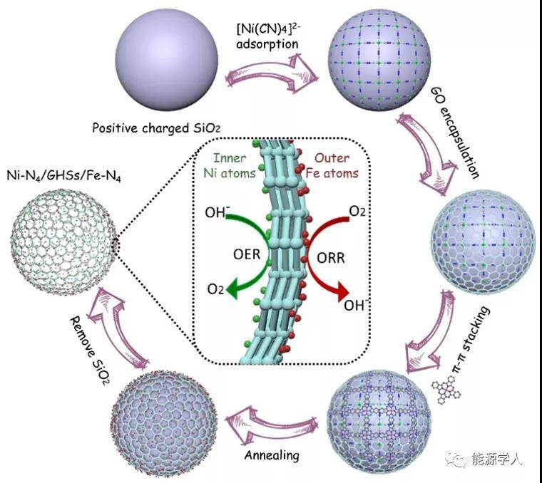 為了實(shí)現(xiàn)具有獨(dú)立功能界面的雙單原子電催化劑的構(gòu)建,本文選擇了傳統(tǒng)的硬模板法,通過先分層自組裝不同的金屬前驅(qū)體,形成三層的金屬前驅(qū)體-石墨烯-金屬前驅(qū)體界面來避免隨后的熱解過程中M-M金屬鍵的形成,最終得到Ni-N4/GHSs/Fe-N4雙單原子材料。具體步驟如下:1)通過靜電作用在二氧化硅球表面均勻地吸附 [Ni(CN)4]2-;2)以帶負(fù)電的氧化石墨烯包覆;3)通過π-π堆積作用將肽菁亞鐵(FePc)錨定在其外表面;4)惰性氛圍下高溫?zé)峤猓?)除去模板后得到內(nèi)層為單原子Ni、外層為單原子Fe的Ni-N4/GHSs/Fe-N4雙功能催化劑。