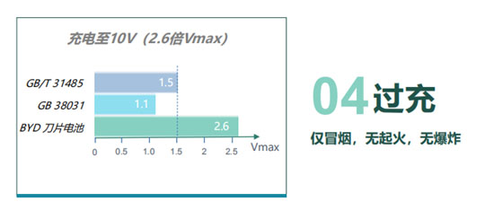 在過(guò)充測(cè)試中,比亞迪刀片電池以1倍率電流充電至終止電壓的2.6倍時(shí)終止充電,并且在1小時(shí)觀察期內(nèi)沒(méi)有出現(xiàn)起火、爆炸等現(xiàn)象。用更高的防過(guò)充標(biāo)準(zhǔn)降低由過(guò)充引發(fā)自燃的幾率,刀片電池讓新能源汽車的安全性能更上一層樓。