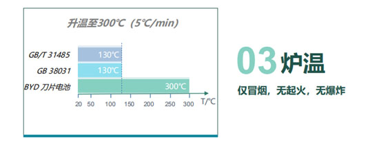 刀片電池使用磷酸鐵鋰材料,耐高溫性能更加優(yōu)異。爐溫測(cè)試中,刀片電池在超過(guò)國(guó)家標(biāo)準(zhǔn)要求溫度2倍多、達(dá)到300°高溫情況下保持30分鐘,期間沒(méi)有出現(xiàn)起火或者爆炸等現(xiàn)象。當(dāng)遇到停車場(chǎng)相鄰車輛起火等狀況,刀片電池超強(qiáng)的耐高溫性能,能夠讓新能源汽車在高溫環(huán)境下最大限度保證電池安全。