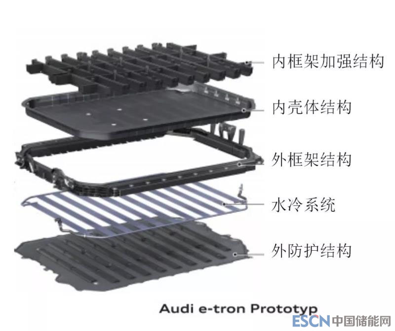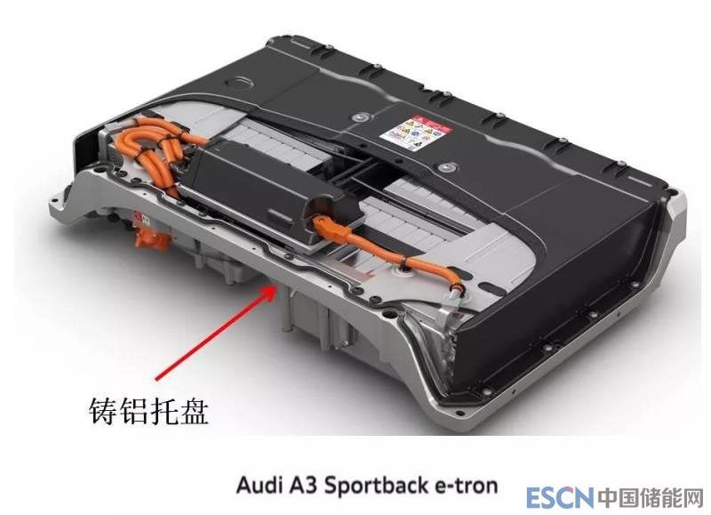 這種結(jié)構(gòu)的托盤,框架結(jié)構(gòu)特點(diǎn)不明顯,但是,整體強(qiáng)度可以滿足電池承截要求。常見于小能量電池系統(tǒng)結(jié)構(gòu)。如下圖的Audi A3壓鑄托盤。