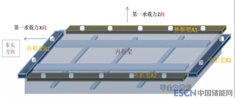 如下圖所示,兩側(cè)外框架A,是電池系統(tǒng)Z向矢量的第一承載者;前后外框架B,主要承載來自X向的矢量載荷。所以說,關(guān)系到托盤吊耳位置或結(jié)構(gòu)設(shè)計(jì),就必須考慮這個(gè)因素。