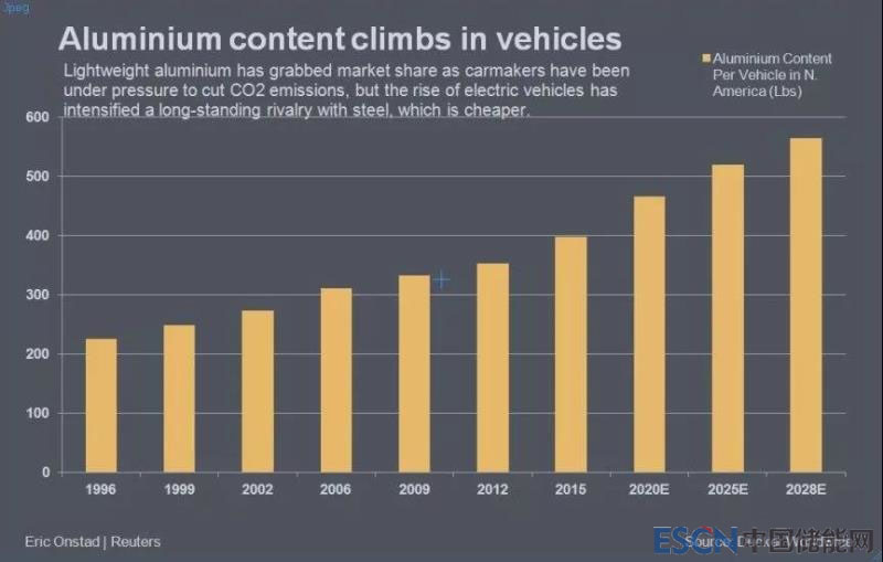 達(dá)克全球咨詢對(duì)北美車均鋁用量進(jìn)行了調(diào)研和預(yù)測,它們發(fā)現(xiàn)從1996年以來,鋁在車輛中應(yīng)用呈現(xiàn)出逐年增長的趨勢,且自2012年開始出現(xiàn)攀升態(tài)勢。2015年時(shí)車用鋁含量已經(jīng)達(dá)到400磅/輛(約合181kg/輛),到2020年則超過450磅/輛(約合204kg/輛),到2028年突破550磅/輛(約合249kg/輛)