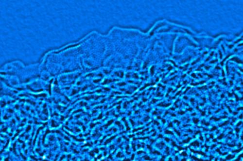 原子分辨率電子顯微鏡圖像顯示的活性石墨烯,表明這種材料包含單一片狀結(jié)晶碳,高度彎曲,形成一種三維多孔網(wǎng)絡(luò),來源:布魯克海文國家實驗室