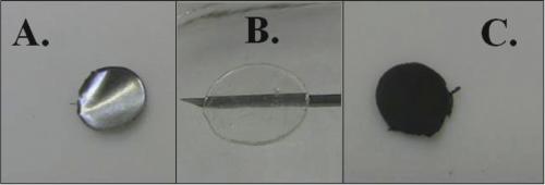 從左至右依次為:(A)鋅陽極(直徑1厘米),(B)EMIHSO4 - 聚乙烯醇分離器(置于一個注射器針頭上,標(biāo)明厚度和透明度),(C)二氧化鉛 - 碳陰極。來源:美國美國海軍研究實(shí)驗(yàn)室