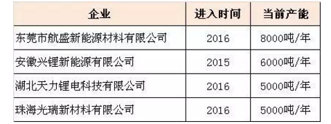 盡管如此,穩(wěn)定的利潤(rùn)空間、鋰電池耗材屬性等兩大特點(diǎn)還是吸引著不少新進(jìn)入者。從2015年后進(jìn)入的企業(yè)來(lái)看,這些企業(yè)具備鮮明特征:比如瞄準(zhǔn)數(shù)碼鋰電池低端市場(chǎng),但囿于掌控六氟磷酸鋰等原材料能力弱及產(chǎn)能小等原因,布局動(dòng)力市場(chǎng)者進(jìn)展緩慢。